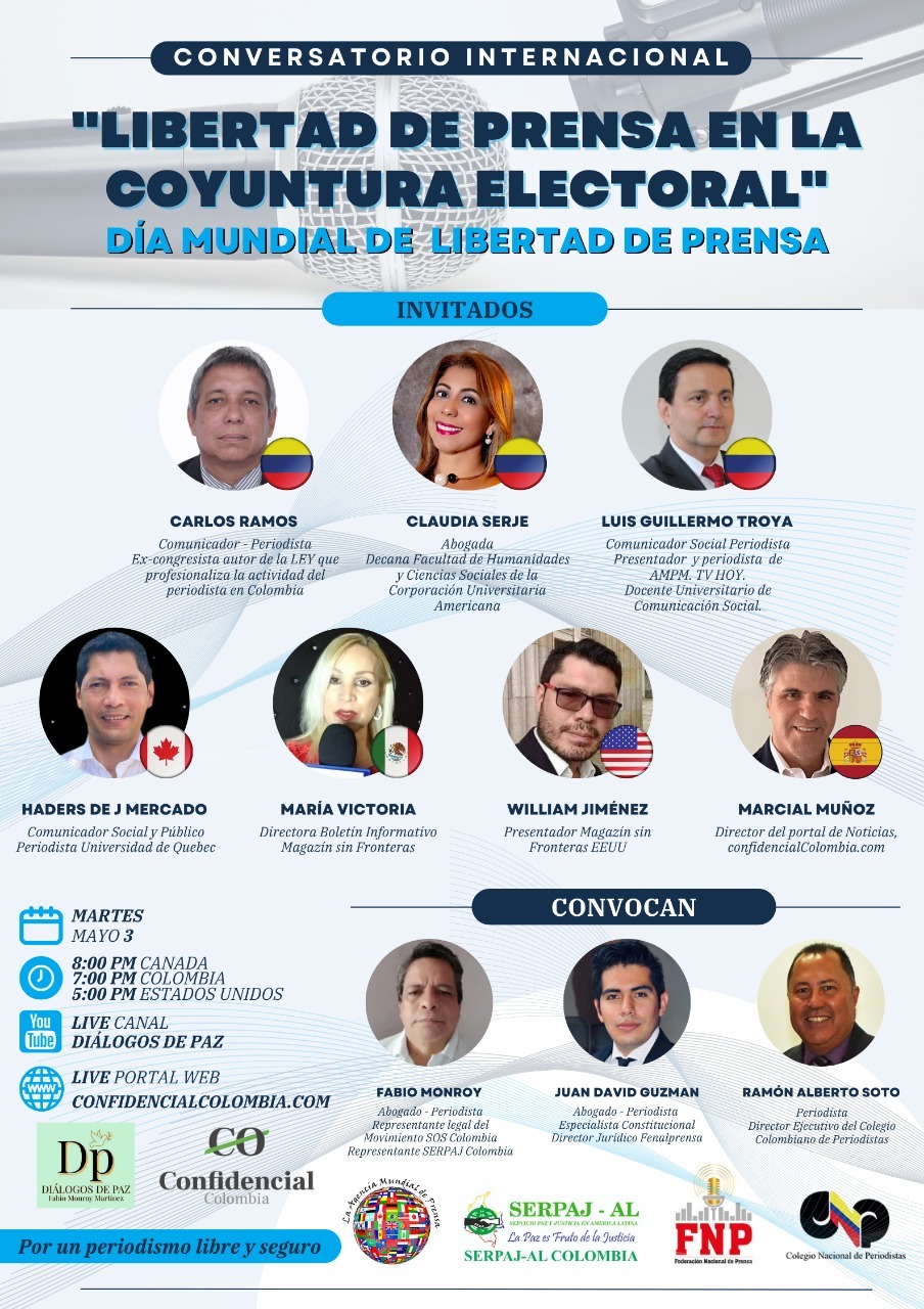 Ante las constantes presiones recibidas en las redacciones de los medios de comunicación por parte de terceros, y en vista de múltiples agresiones de las que son víctimas periodistas de canales comerciales y comunitarios en la coyuntura electoral, la Agencia Mundial de Prensa; el Servicio Paz y Justicia en América Latina (SERPAJ-AL); el Colegio Nacional de Periodistas (CNP); La Federación Nacional de Prensa (FENALPRENSA); y el portal web de noticias www.confidencialcolombia.com invitan al conversatorio Internacinal "Libertad de Prensa en la Coyuntura Electoral". Este martes, 3 de mayo, a las 7:00 p.m., en el canal de YouTube Diálogos de Paz.