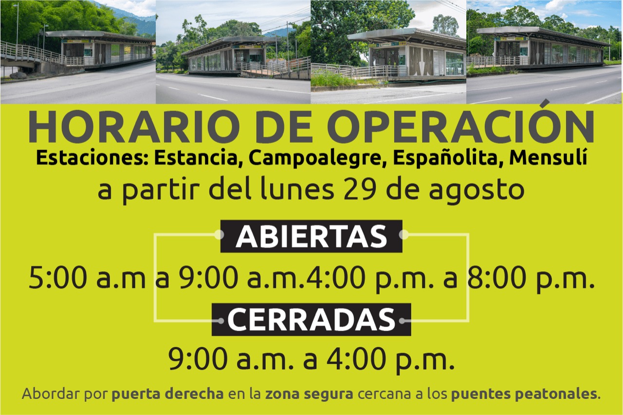 Como medida para reducir la evasión y el hurto de la infraestructura en las estaciones Estancia, Mensulí, Campoalegre y La Españolita; el Sistema Integrado de Transporte Masivo (SITM) Metrolínea adoptó la decisión de cerrar dichas estaciones entre las 9:00 a.m. y 4:00 p.m. y nuevamente a las 8:00 p.m. una vez finalice el servicio de taquilla de lunes a domingo.
