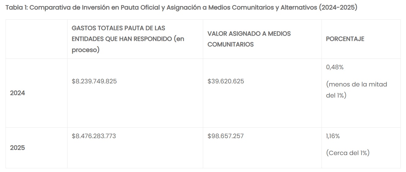 La tabla comparativa resume la situación, durante la vigencia de la actual administración, de la pauta o divulgación en medios de comunicación, como se puede observar, en la vigencia 2024 el porcentaje adjudicado a los MCCA fue inferior al 1% y en lo corrido del 2025 escasamente supera el 1%.